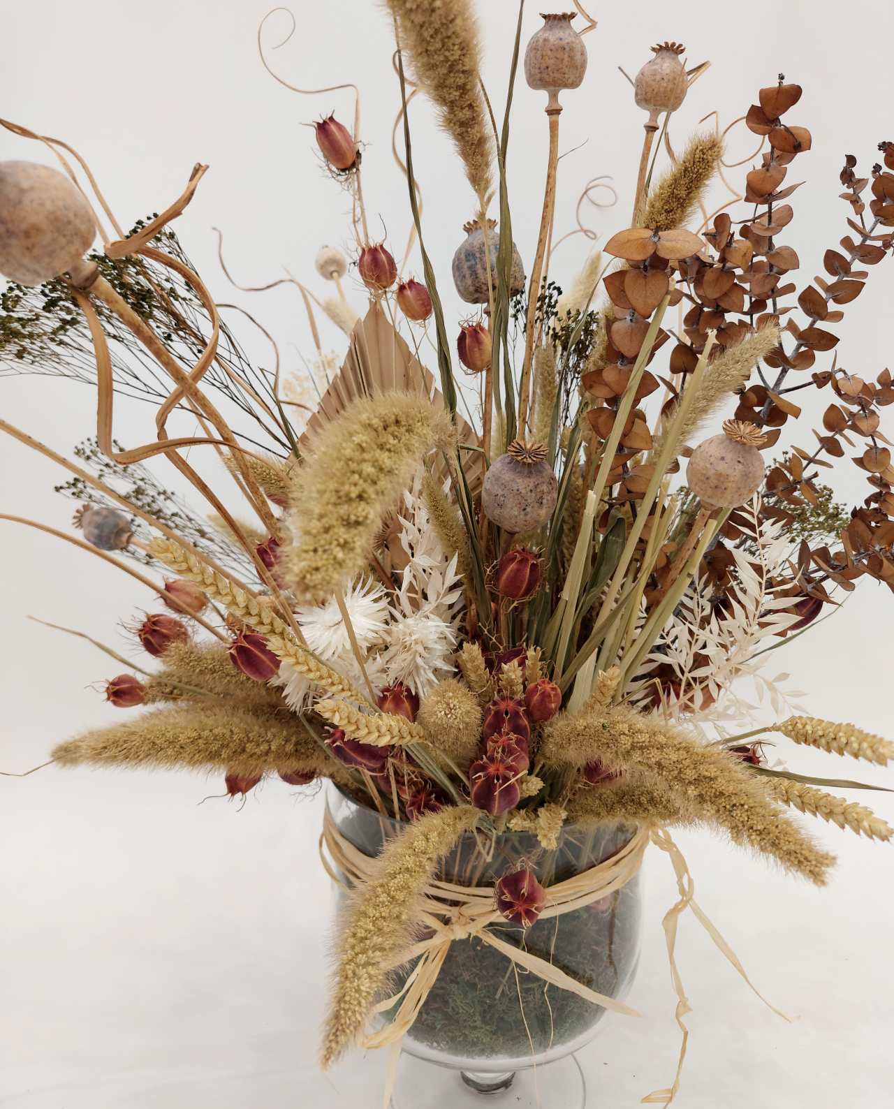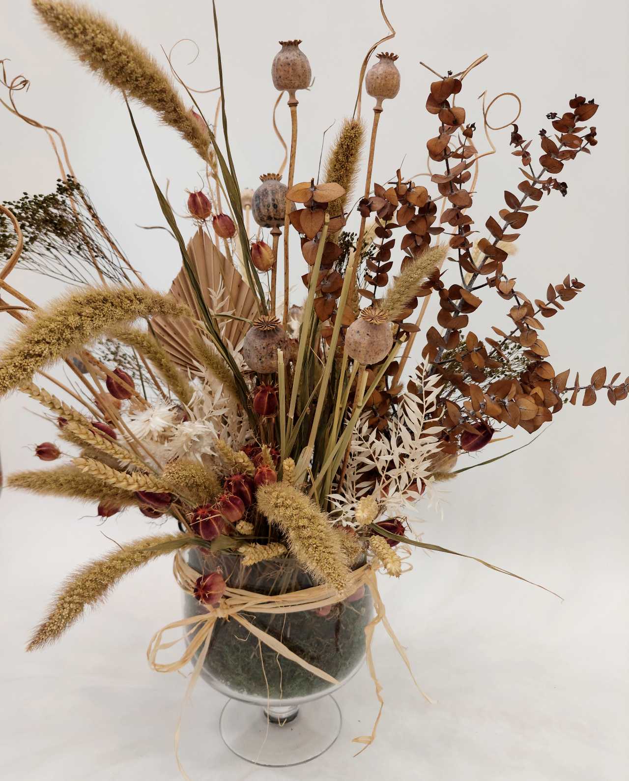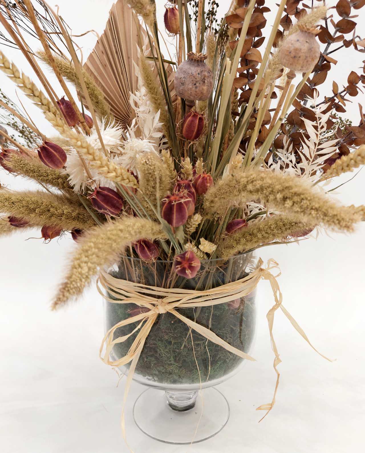 This spectacular centerpiece features a variety of dried flowers such as Setaria, wheat, eucalyptus, and natural botanicals in an elegant vase with moss base.