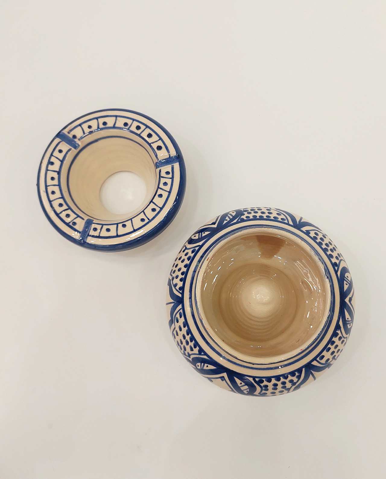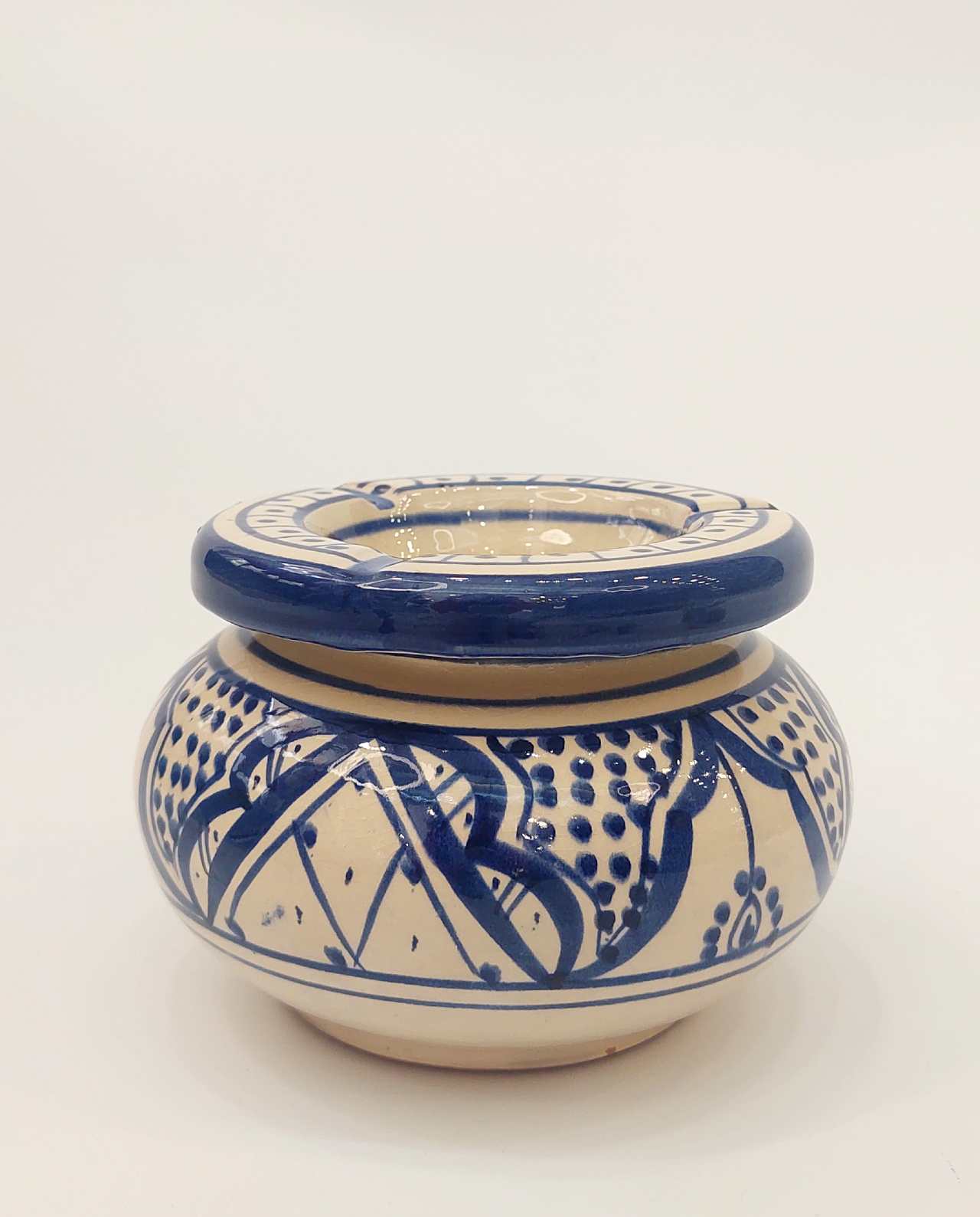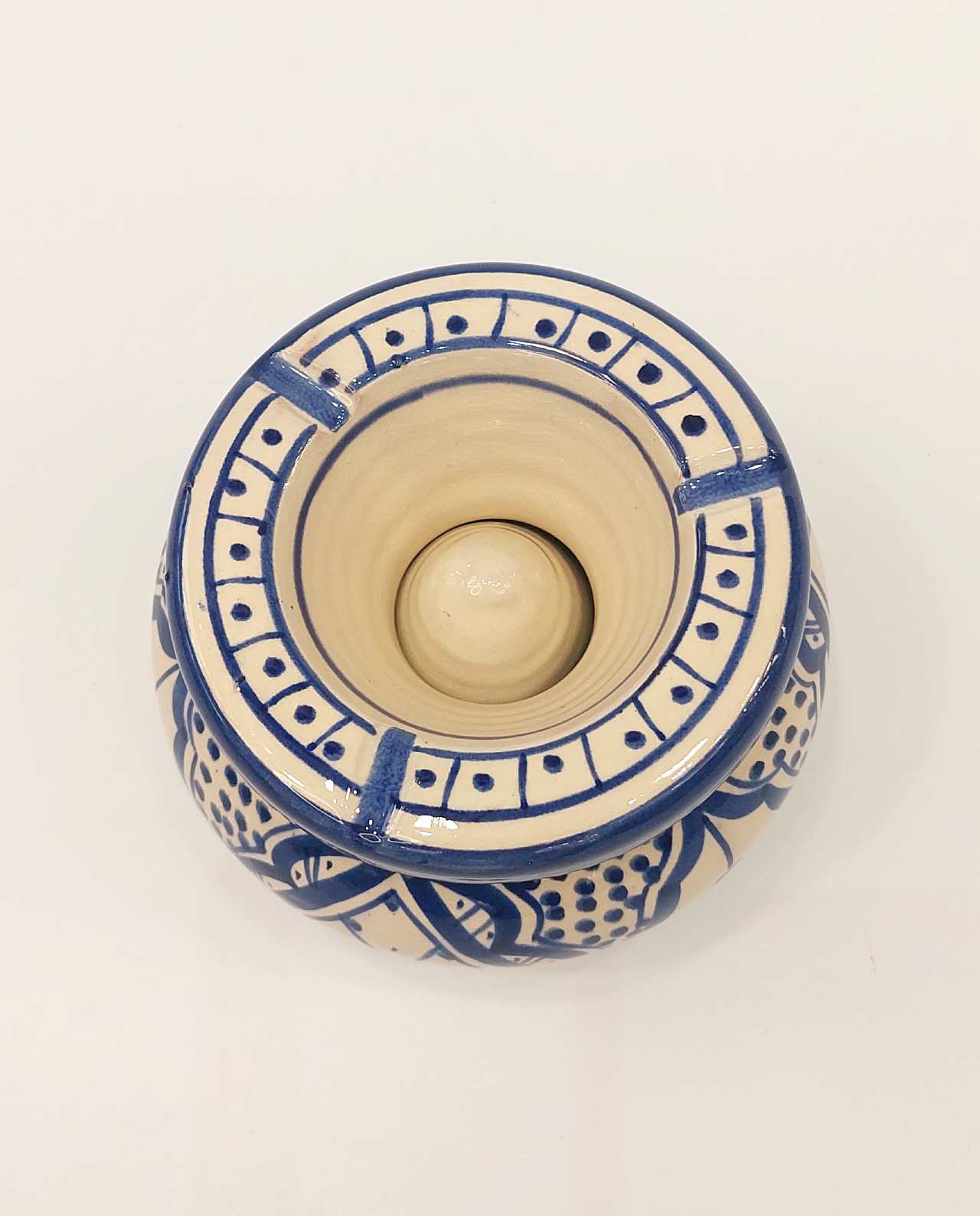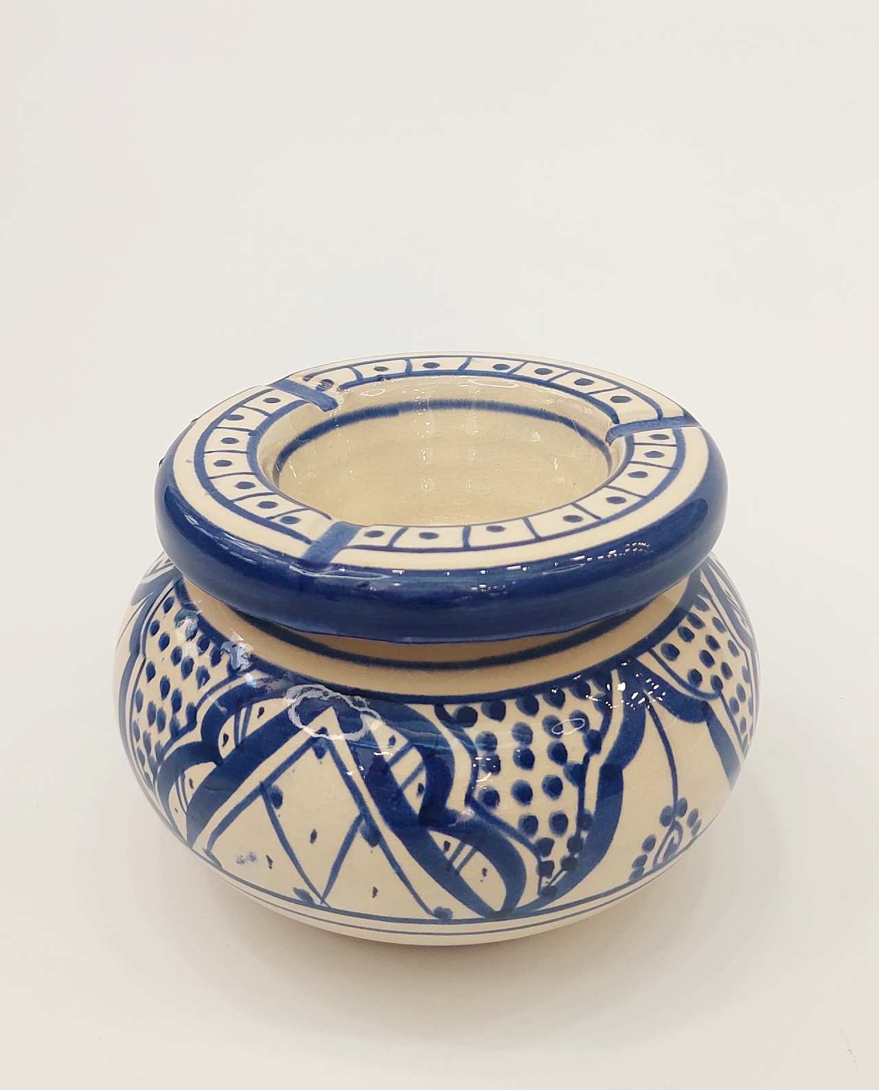 Where everyday function meets artisan craftsmanship. This ceramic ashtray is entirely hand-thrown and hand-painted, decorated with a rich cobalt blue and cream palette featuring flowing botanical motifs, geometric dot-work borders, and bold brushstroke details — a style rooted in centuries of Mediterranean folk pottery.
