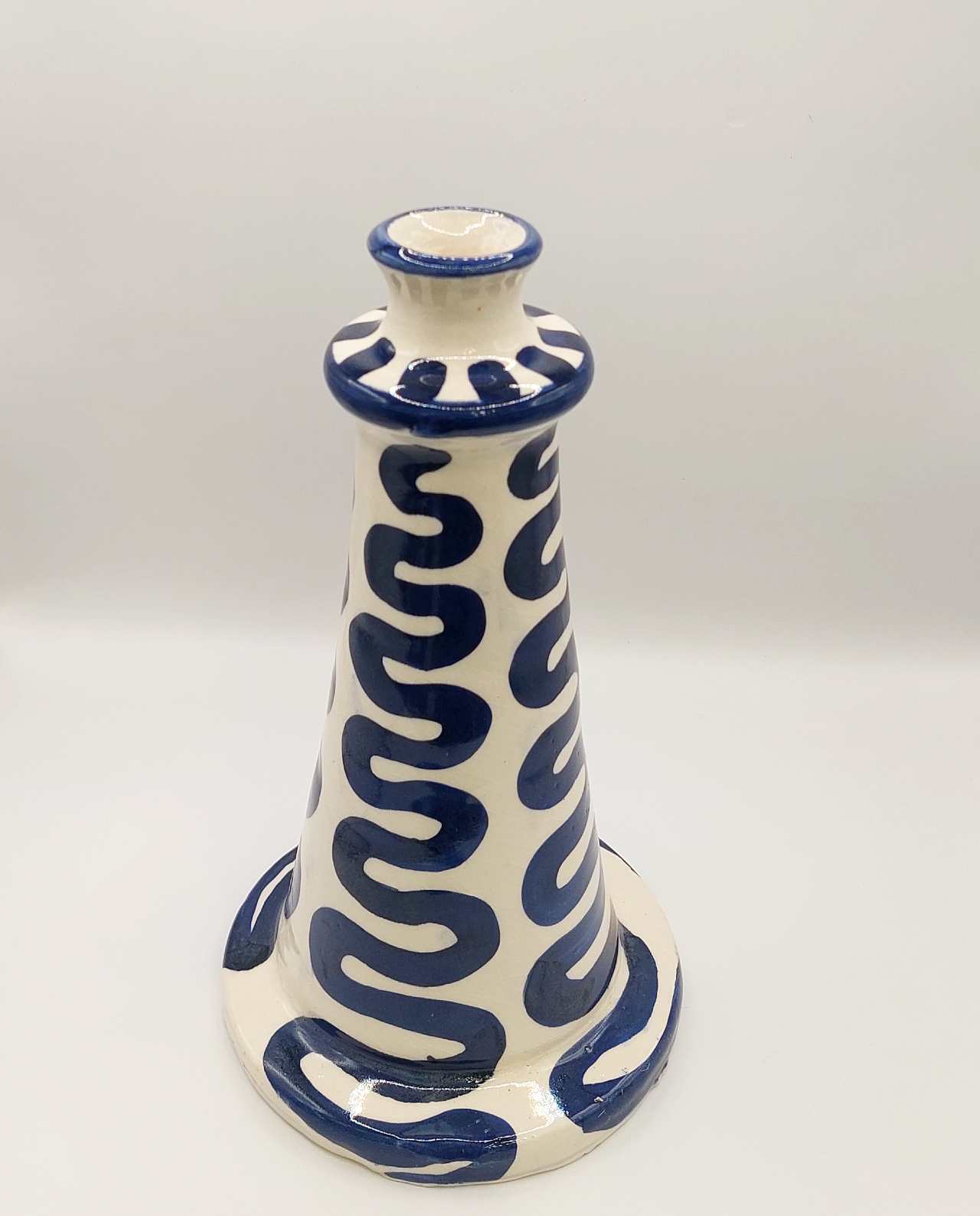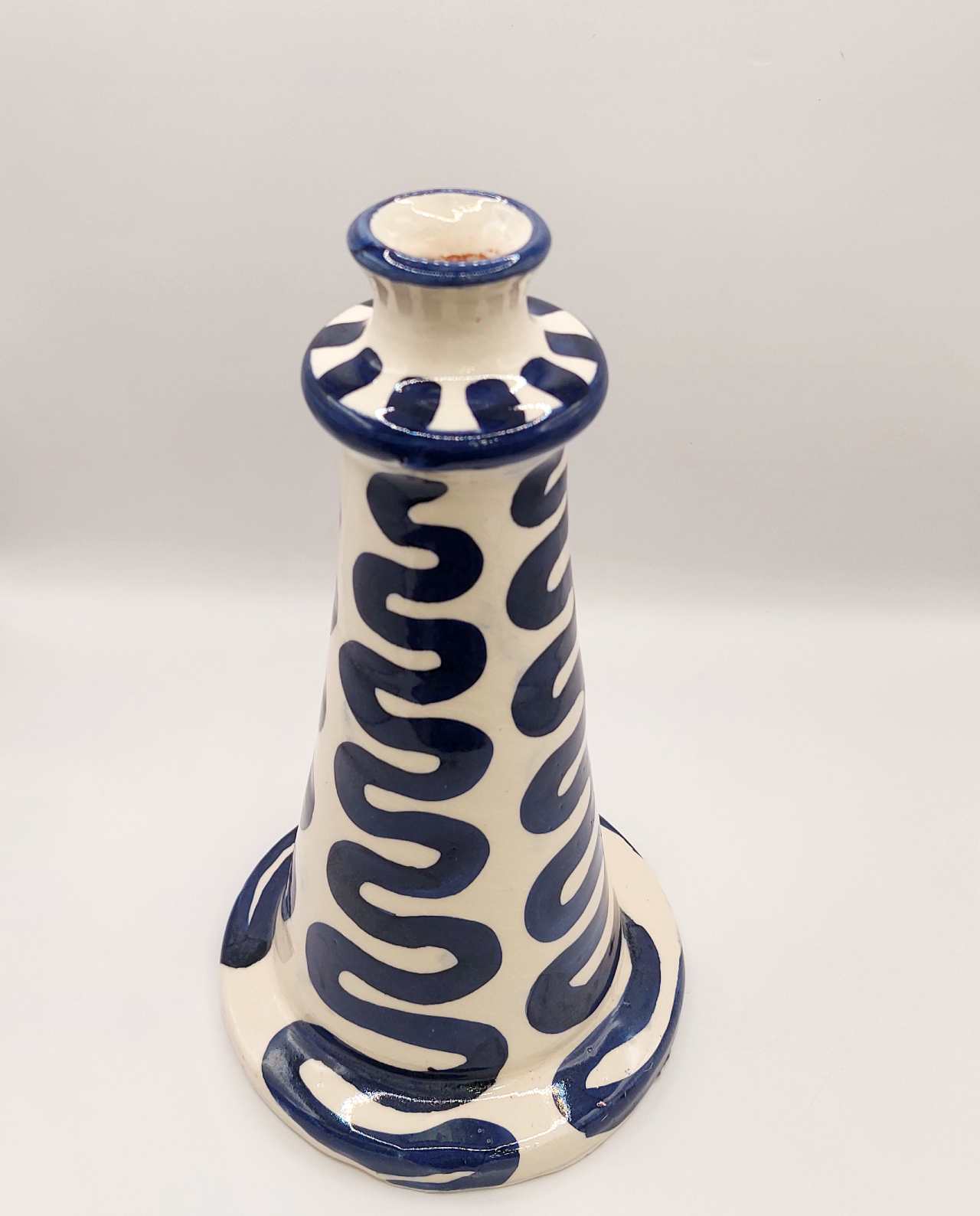 This ceramic candleholder is a sculptural object in its own right. Standing 23 cm tall, it is hand-thrown on the wheel and decorated entirely by hand with a continuous flowing wave pattern in deep cobalt blue against a warm cream glaze. The generous flared base, tapered column and rounded candle cup give it a confident, architectural silhouette — a form that draws the eye whether or not a candle is burning.