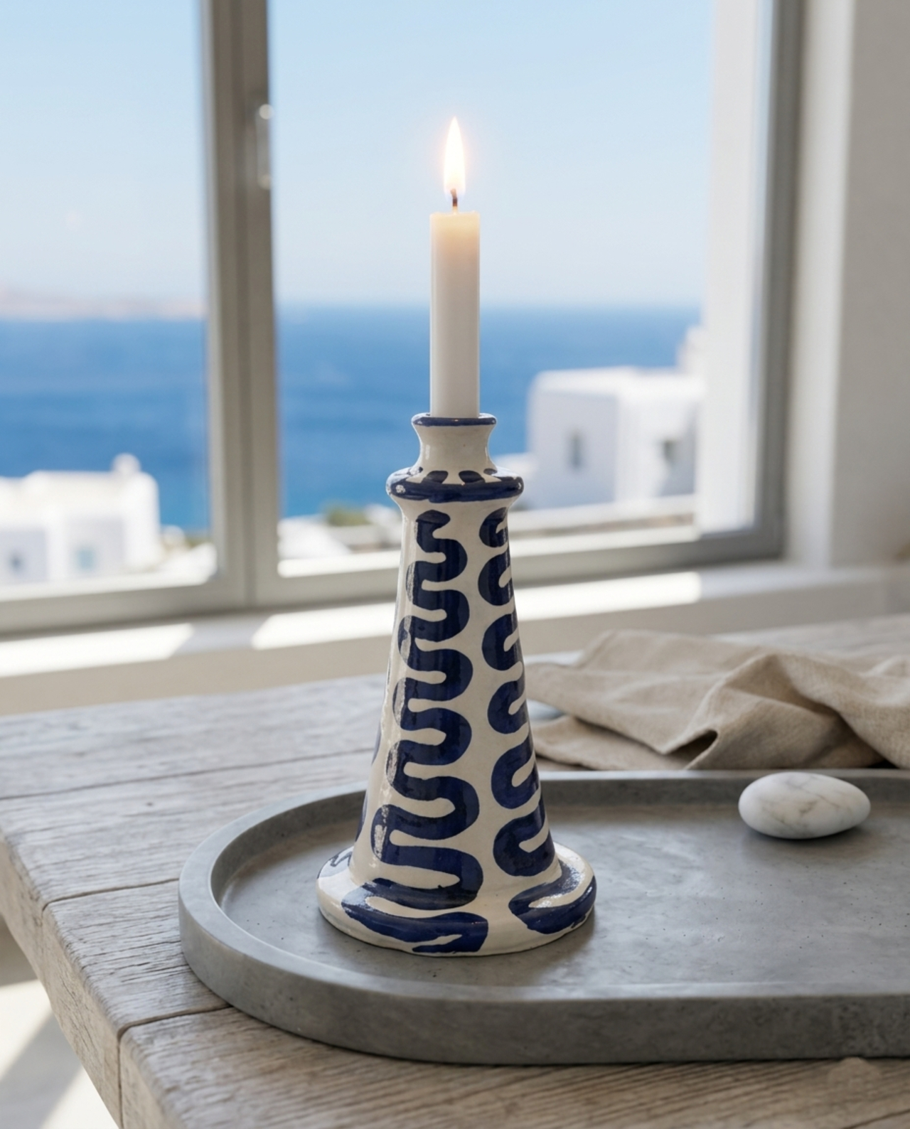 Light meets artistry. This 23 cm handmade Greek ceramic candleholder is entirely hand-thrown and hand-painted, featuring flowing cobalt blue wave motifs on a cream glaze — a bold, sculptural form that looks as stunning unlit as it does in candlelight.
