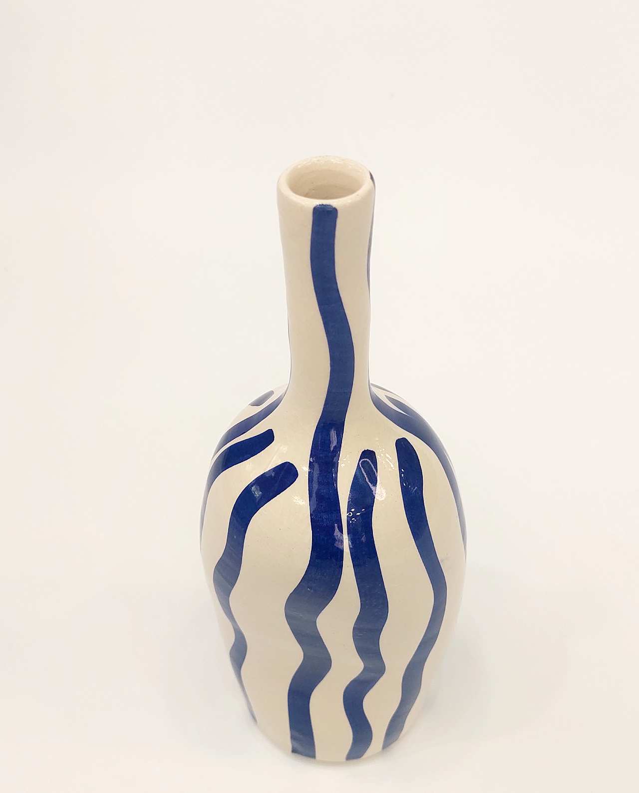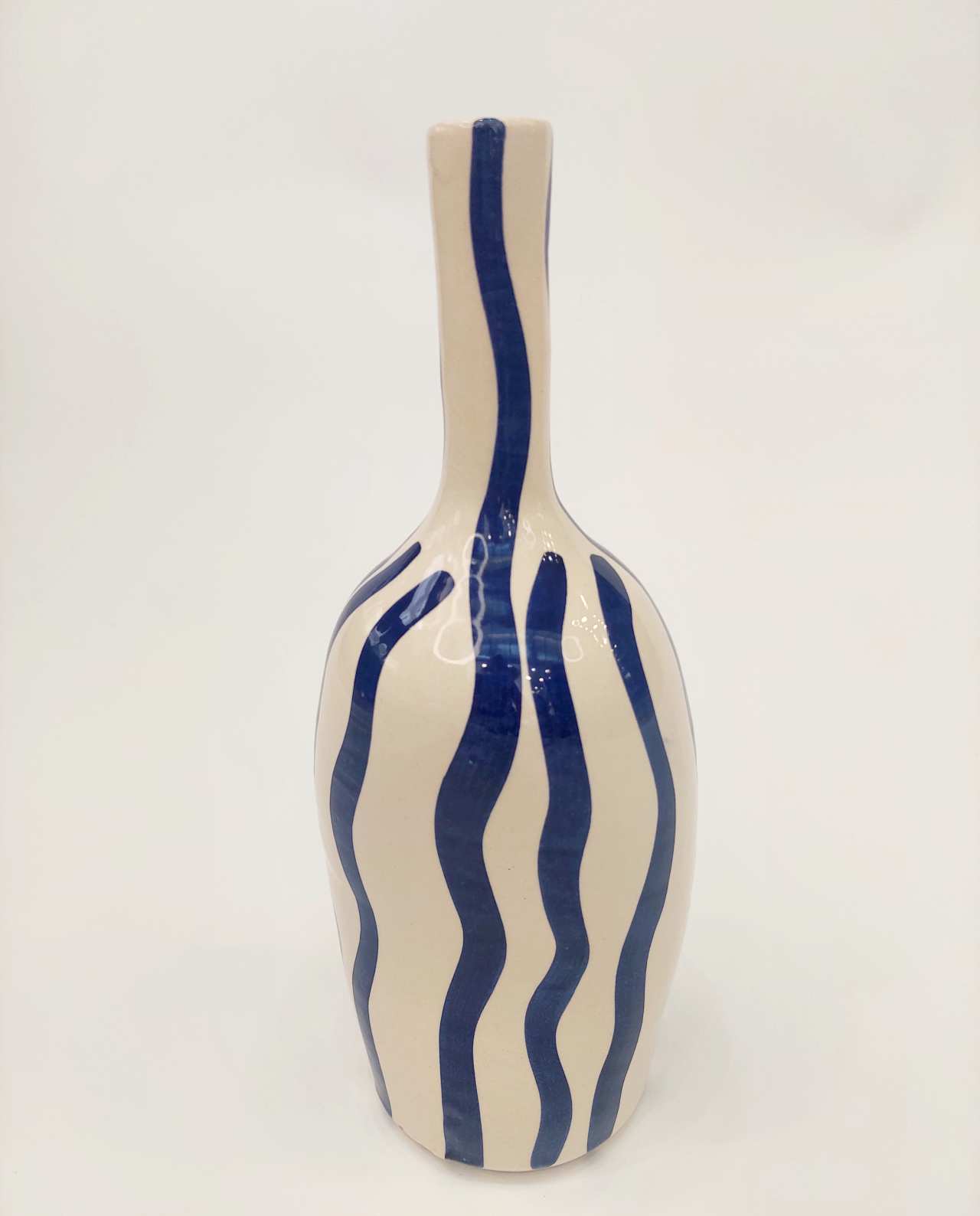 Handmade Greek ceramic vase, 18 cm tall. Handpainted bottle shape with artistic wavy stripes. Each piece unique, crafted by Greek artisans. Perfect for single flowers or standalone statement piece. Authentic Mediterranean pottery celebrating traditional craftsmanship. Modern organic design meets timeless artistry.