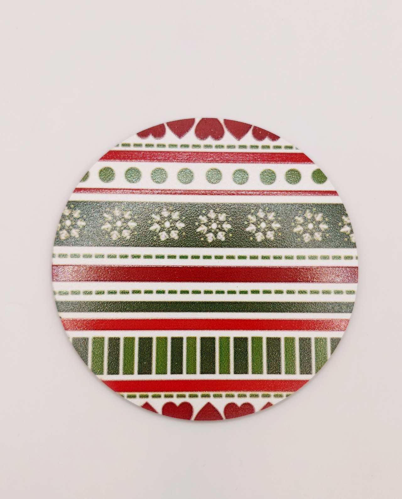 A beautifully crafted set of 6 wooden coasters, each featuring a unique laser-printed Christmas patterns vibrant, playful colors. The reverse side is hand-painted, adding an artisanal and warm touch. They combine practicality with style, protecting surfaces while bringing a lively winter atmosphere to your table. A perfect gift for décor lovers or anyone who appreciates unique, artful pieces.