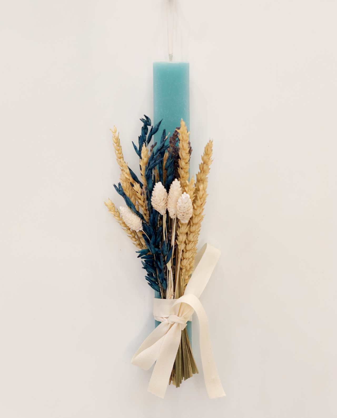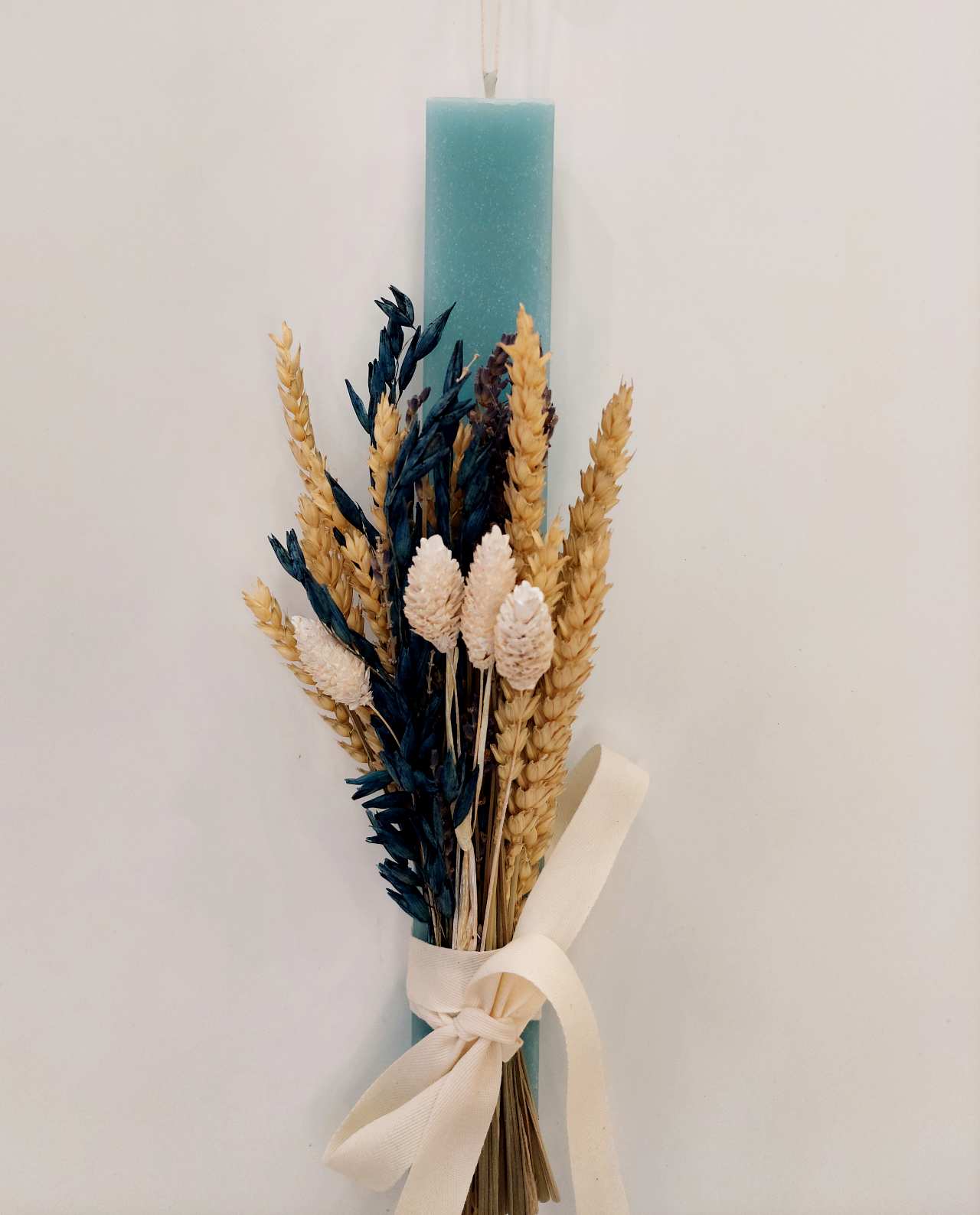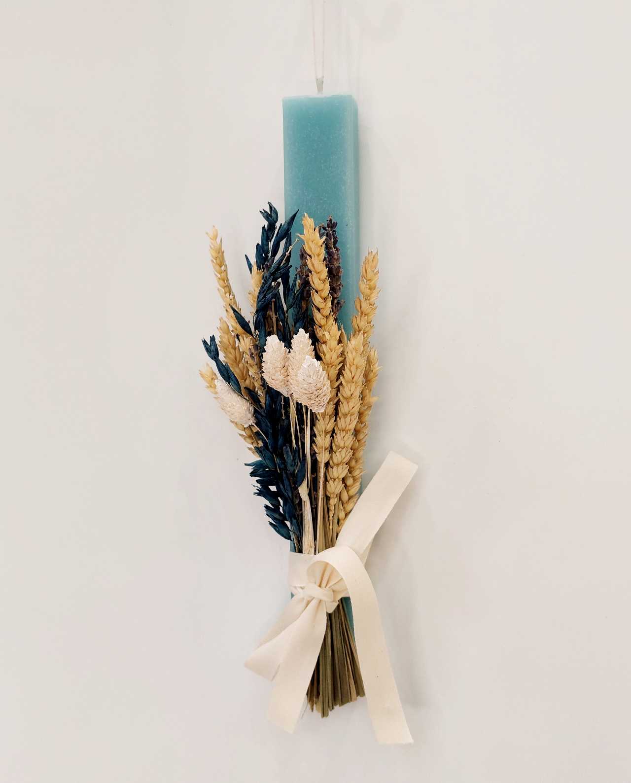 Handmade Easter candle adorned with an exquisite dried flowers bouquet featuring blue oats, wheat, and natural color flowers.