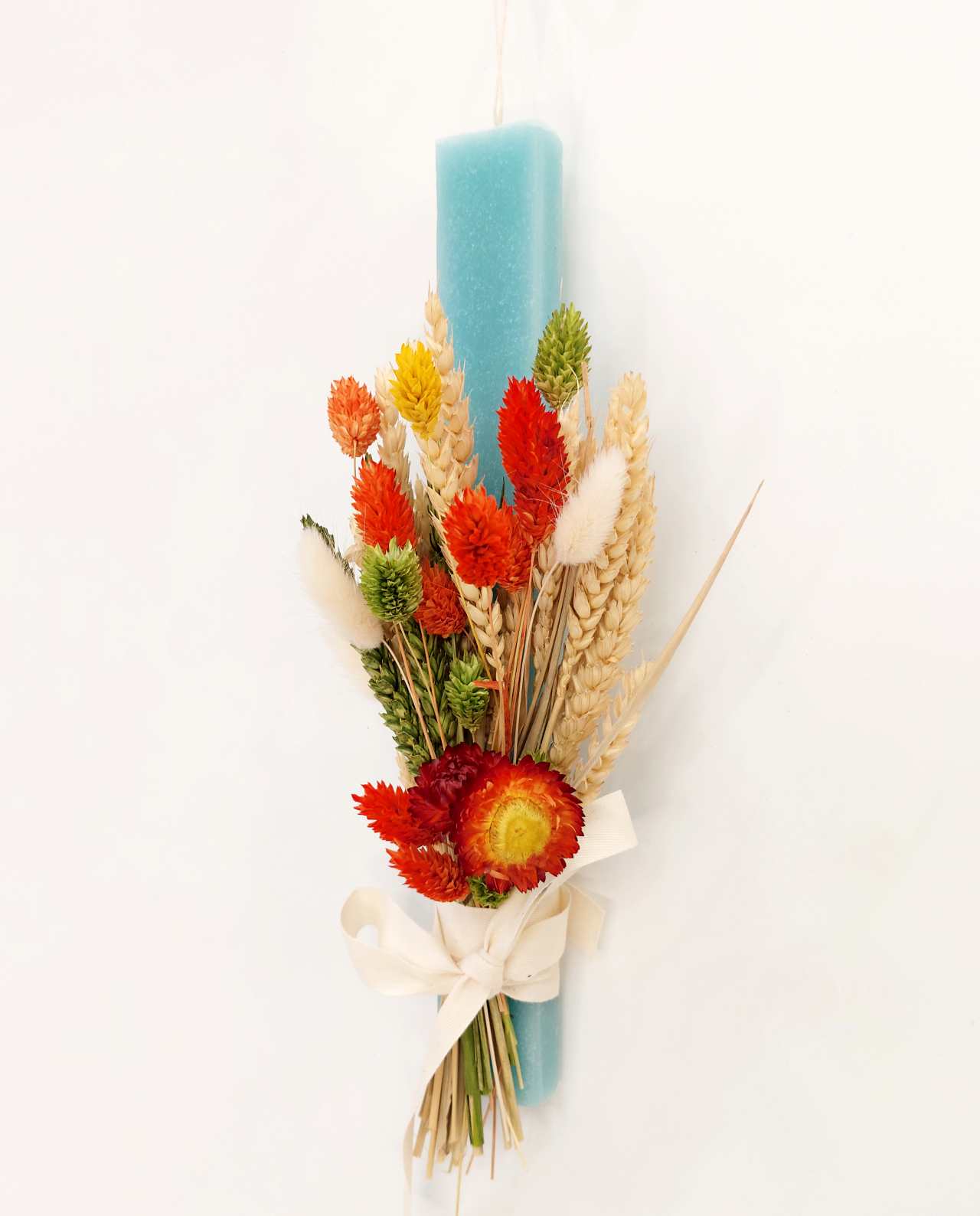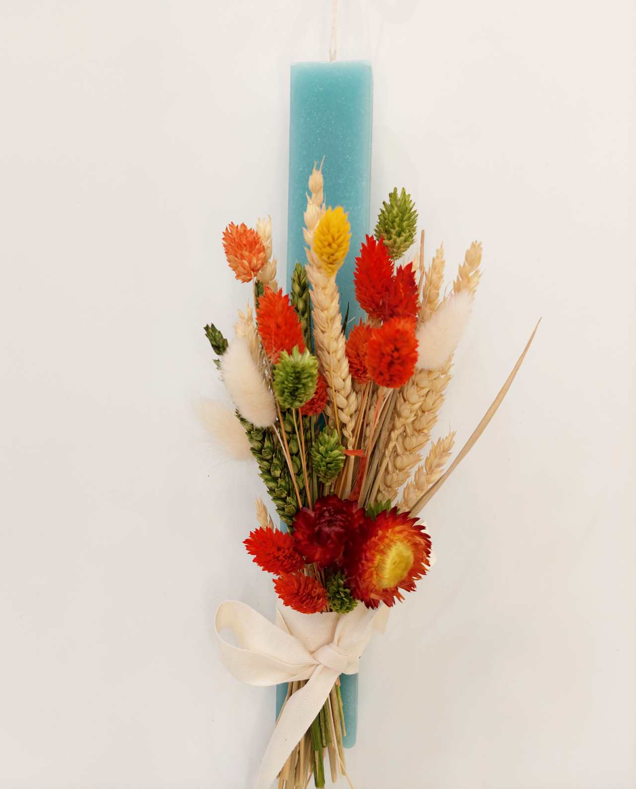 Handmade Greek Orthodox Easter candle with dried flowers bouquet. Orange Chrysanthum, wheat & botanicals. Traditional godparent lambada gift. Preserved flowers last forever. High-quality candle. Honors sacred Greek custom. Perfect for godchildren & loved ones. Timeless beauty meets natural elegance.