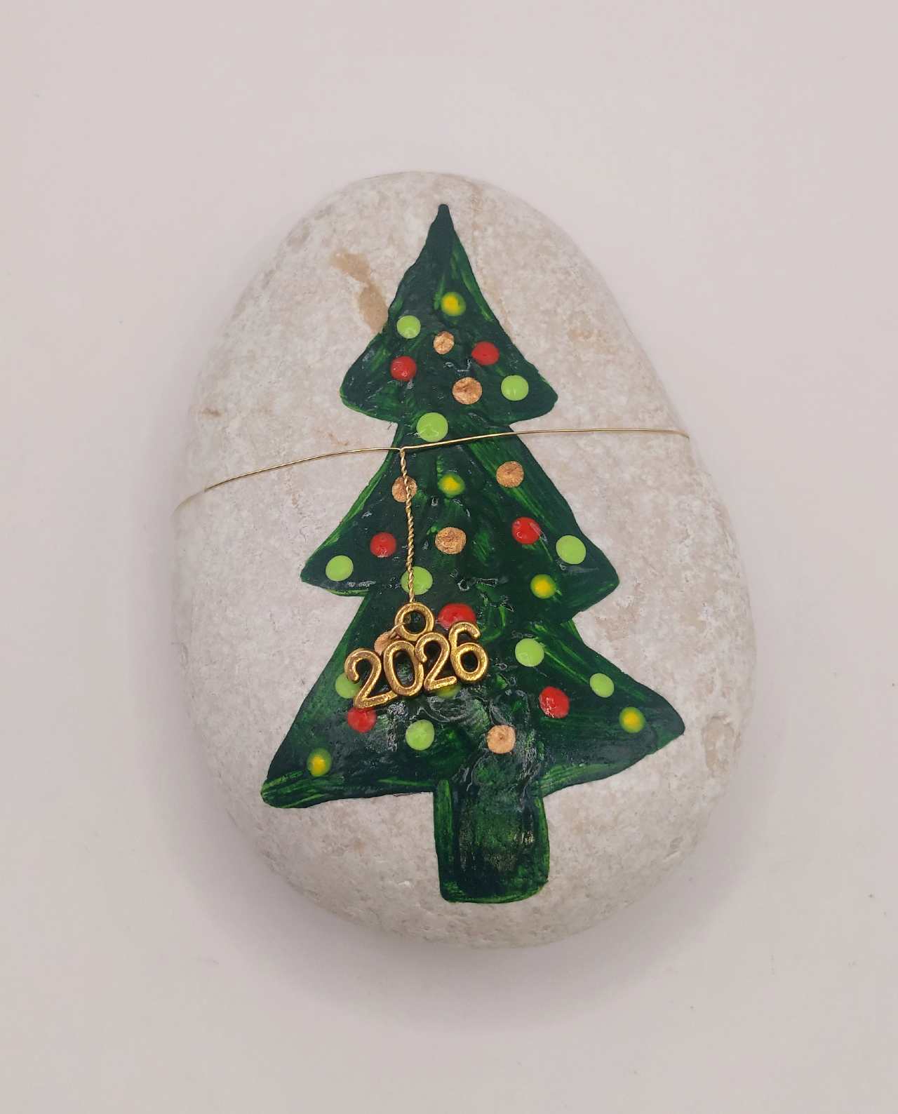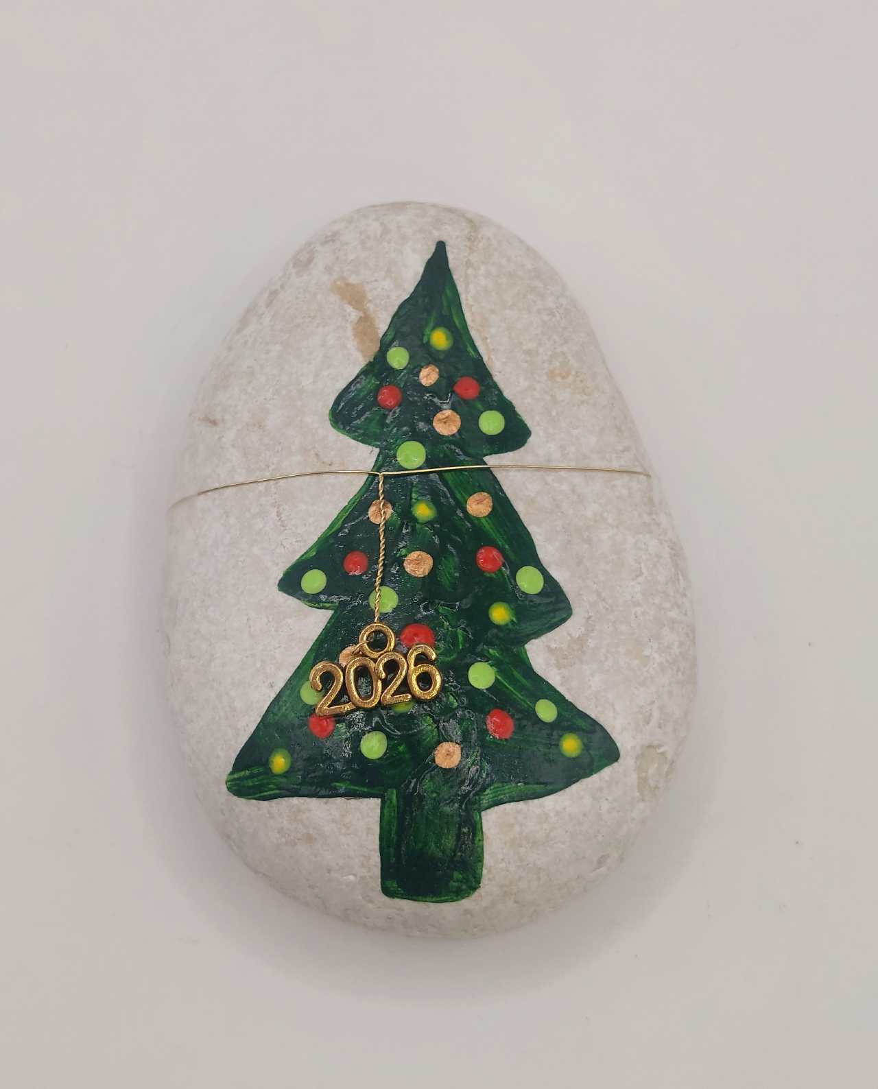 A handpainted natural stone with a Christmas tree and 2026 charm for your home decor or to give away as a genuine gift.