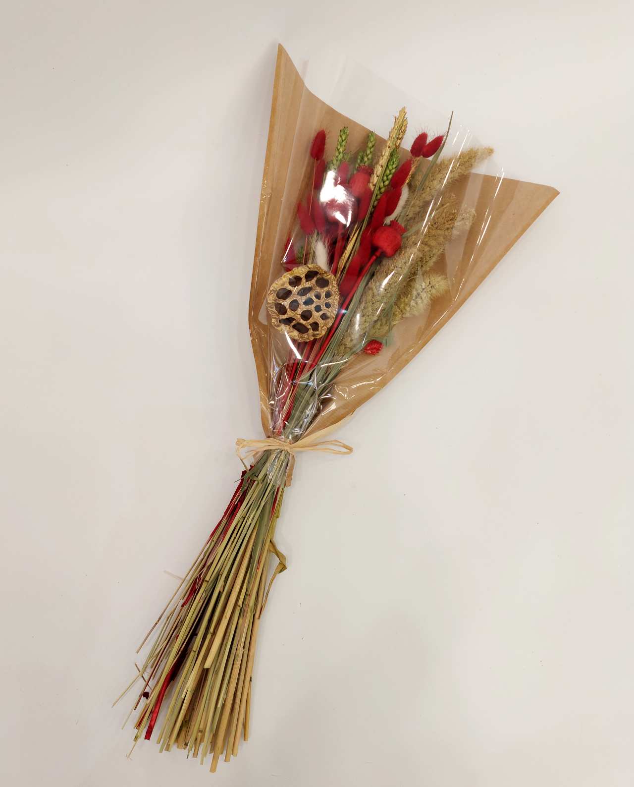 Ένα εντυπωσιακό μπουκέτο αποξηραμένων λουλουδιών σε κόκκινες, πράσινες και φυσικές αποχρώσεις που φέρνει ζεστασιά και γιορτινή ατμόσφαιρα στον χώρο σου. Οι φυσικές υφές και τα οικολογικά υλικά δημιουργούν διακόσμηση με στιλ και διάρκεια, χωρίς ανάγκη συντήρησης. Ιδανικό για τραπέζι, δώρο ή εορταστική βιτρίνα.