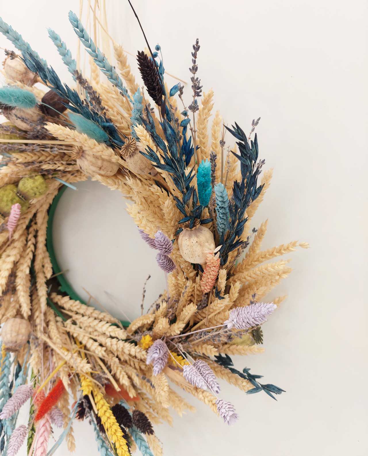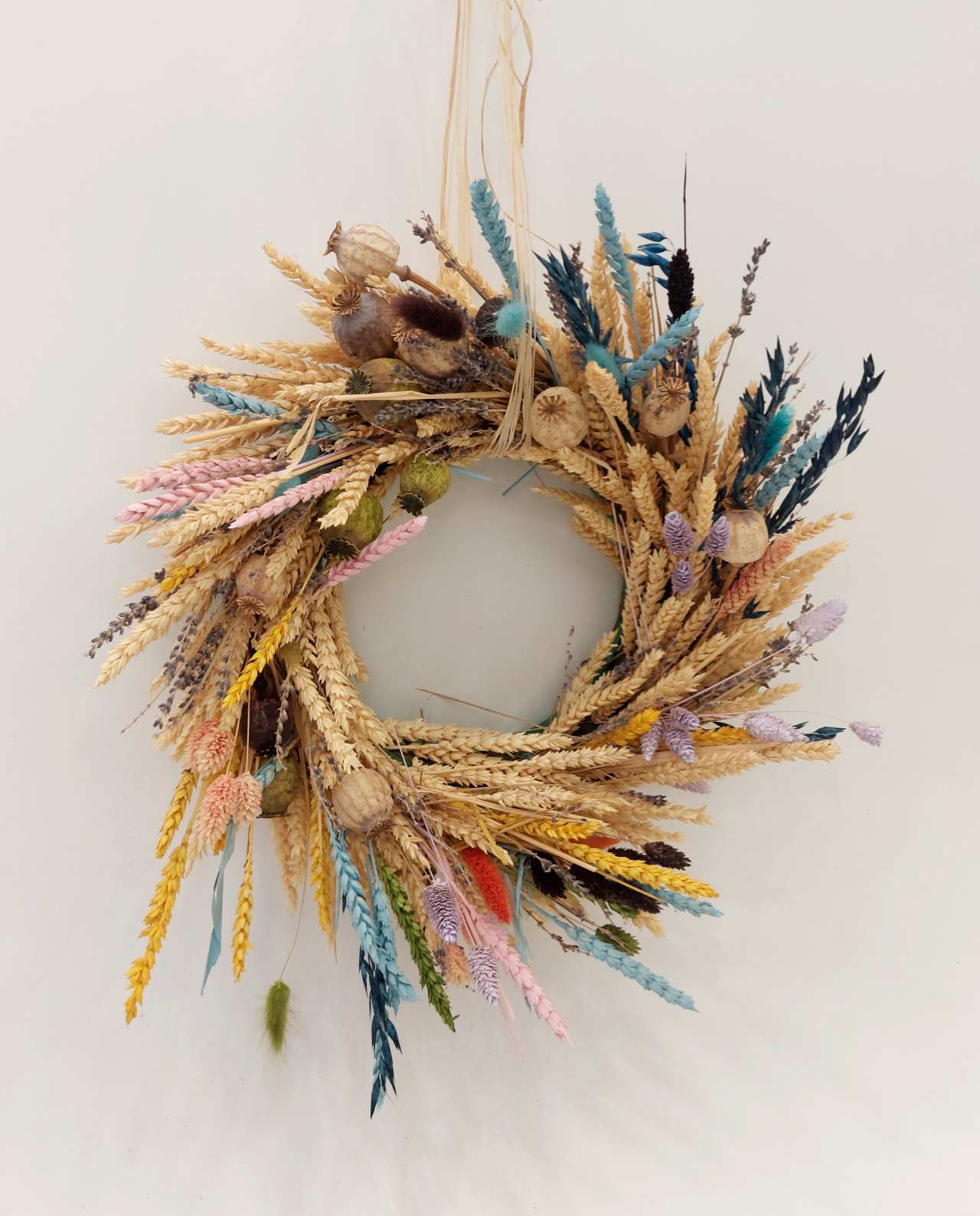 Γιορτή ζωής, αυτό το χειροποίητο στεφάνι πλέκεται από βιώσιμα συλλεγμένο σιτάρι, lagurus, κεφαλές παπαρούνας και αγριολούλουδα — φυσικά αποξηραμένα, χωρίς νερό και χωρίς απόβλητα.