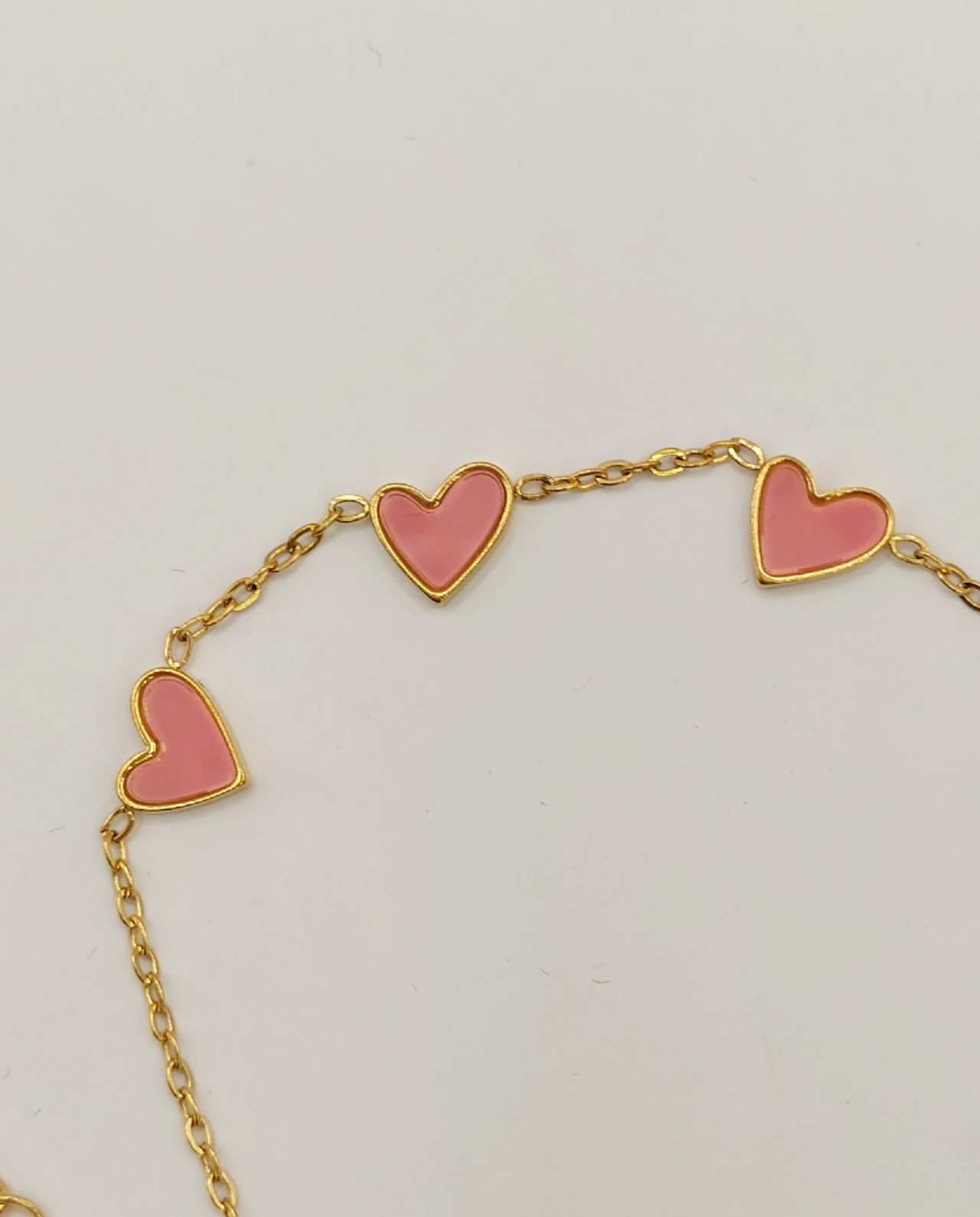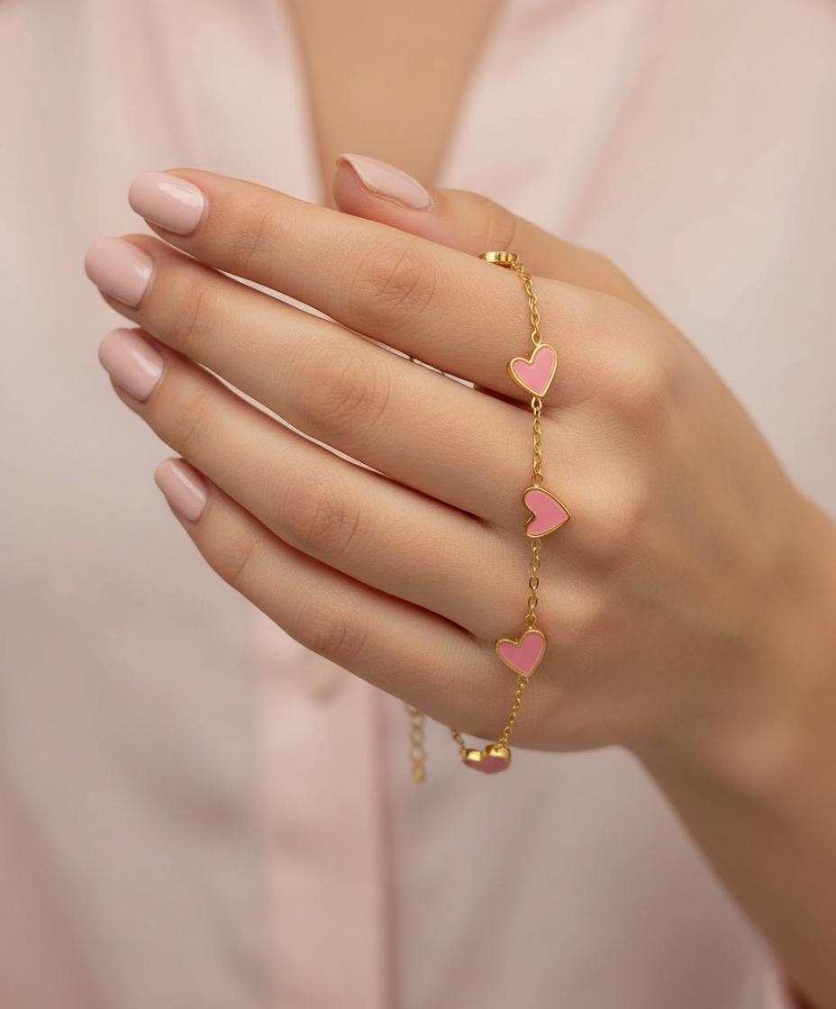 Χαρακτηριστικά Προϊόντος: Αυτό το όμορφο βραχιόλι παρουσιάζει ροζ καρδιές από σμάλτο τοποθετημένες κομψά κατά μήκος μιας λεπτής αλυσίδας. Το λείο, γυαλιστερό φινίρισμα του σμάλτου δημιουργεί εντυπωσιακή αντίθεση με το ζεστό χρυσό περίβλημα, ενώ η λεπτή αλυσίδα προσθέτει μια αέρινη, θηλυκή πινελιά. Το minimalist σχέδιο εξασφαλίζει ότι αυτό το κόσμημα παραμένει ευέλικτο και αιώνια κομψό.